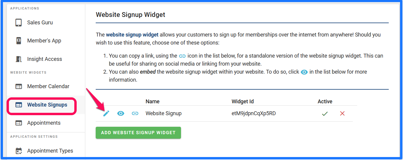 2. Click the blue eye icon for information on embedding the signup widget into your website.