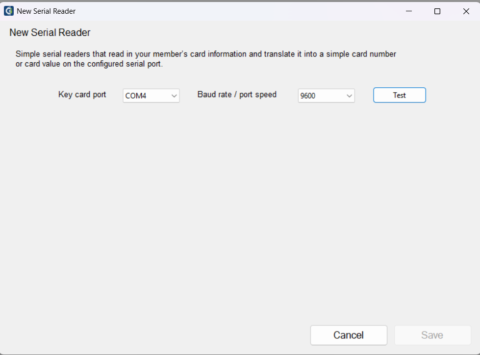 Click Test. (Note: The name of the Key card port, e.g., COM5, COM6, is specific to each USB port, so plugging the scanner into different USB ports may cause it to not be recognized.)
