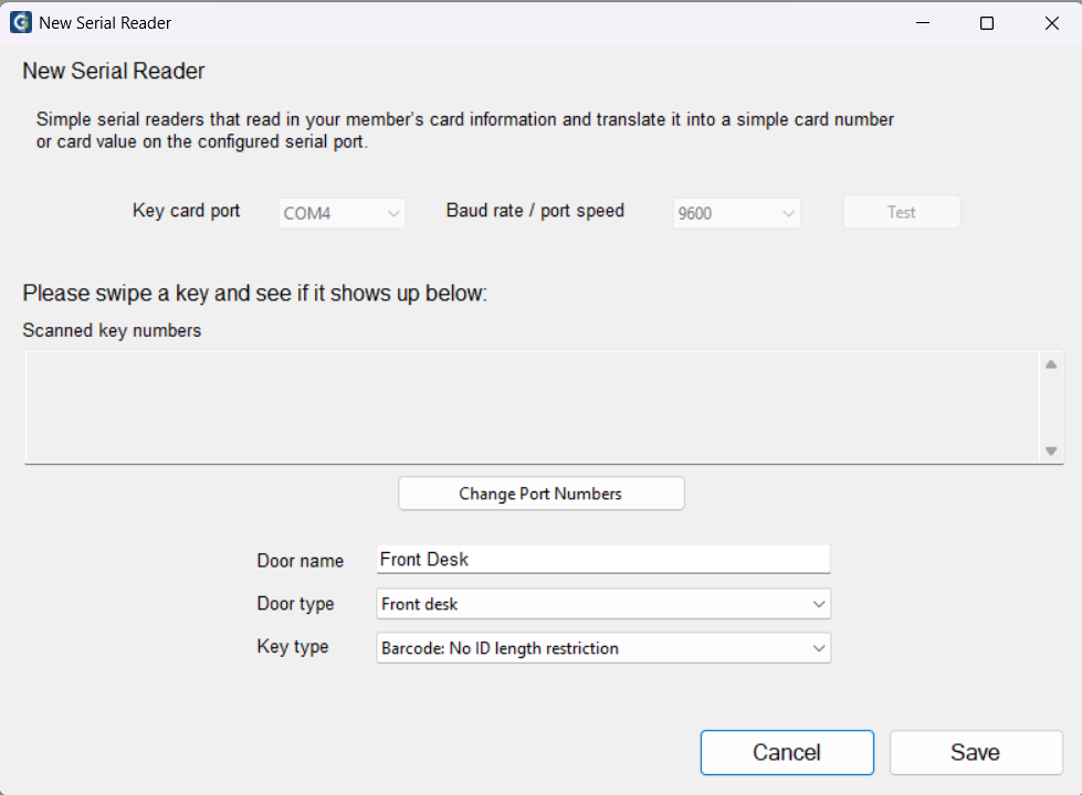 Choose a Door name (Front Desk) and Door Type (Front Desk). Ensure Key type is Barcode.