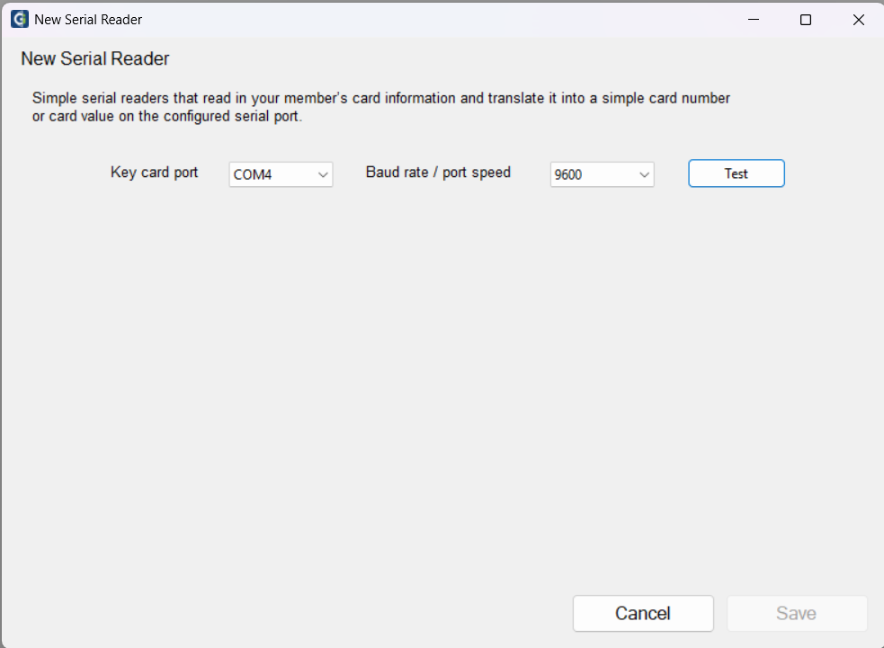 Click Test. Note: The name of the Key card port, e.g., COM5, COM6, is specific to each USB port, so plugging the scanner into different USB ports may cause it to not be recognized.