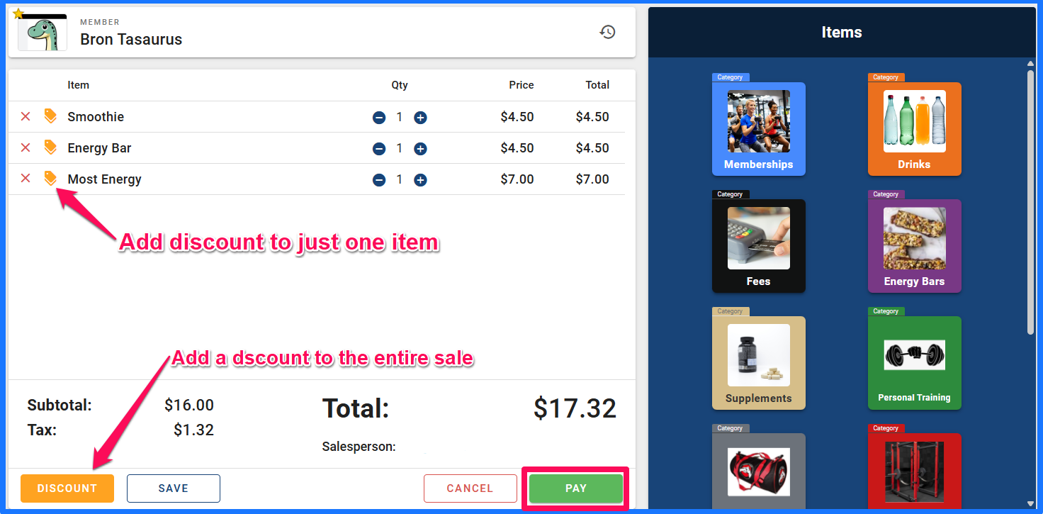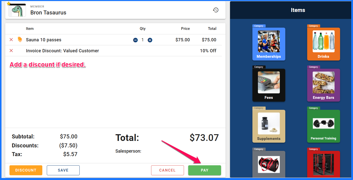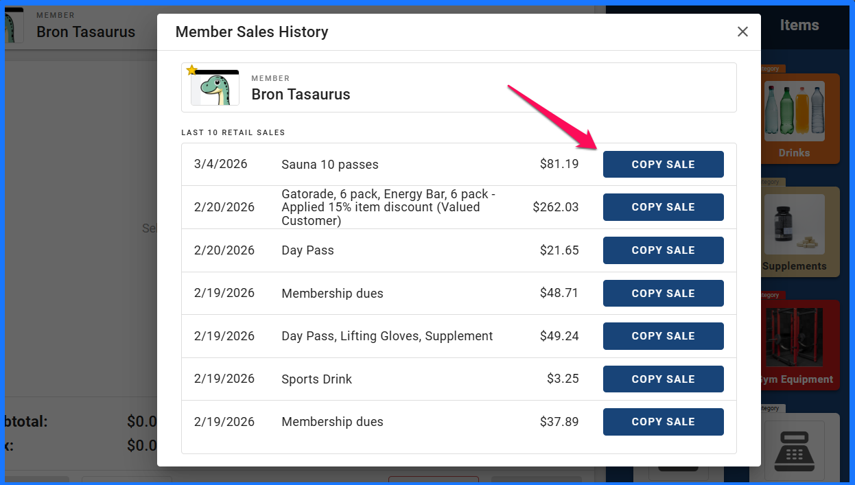 - Navigate to the member's account or click add sale from your quick actions tab on your dashboard.