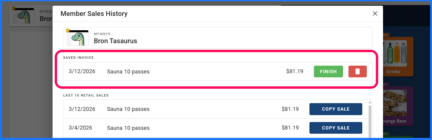 To pick up this sale after it is saved, pull up member in question, click add sale and again, click historical button inside of POS. The saved sale will be present under the Saved Invoice. Now you can choose Finish or Delete.