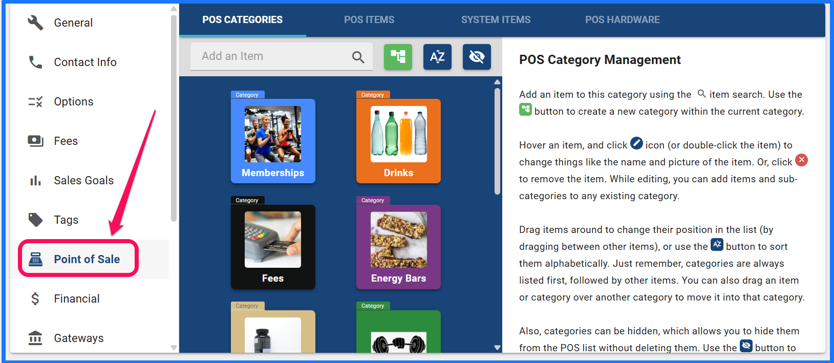 The POS does allow for products' UPCs to be loaded into the system. This allows the scanner to be used to ring up products. It is a time-saving process that is faster than using the categories and item buttons to select a product, which is also still an option. You could also assign custom barcodes, for in-house products like merchandise. To register the UPC/barcode to the system, it is required to navigate to the POS menu in the Settings area of Gym Insight. First click the Home drop-down, and select settings. Once the General Settings page loads, please select the POS option, which is located on the left side of the screen.