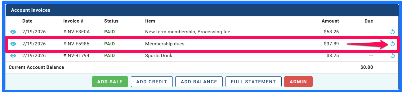 1. Access your member’s account and locate the transaction you want to refund.