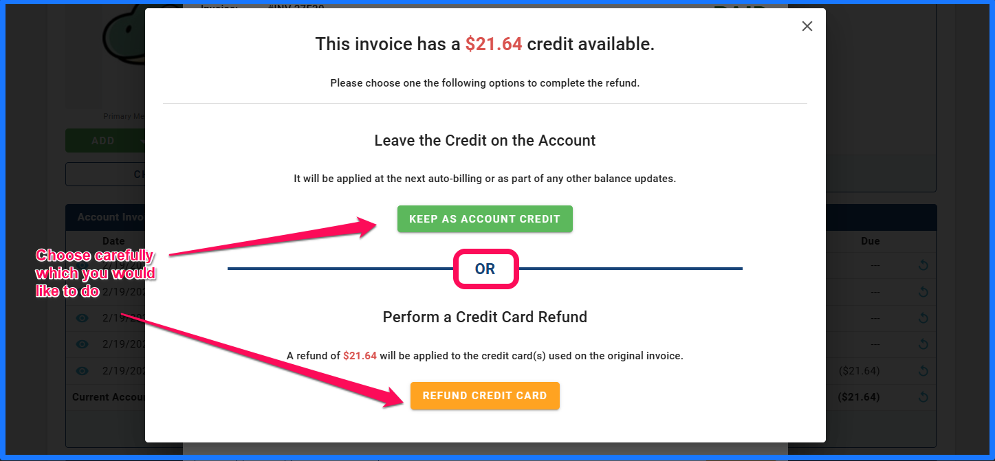 - After you verify that is what you wish to refund, another window will populate to have you choose how the credit is to be dealt with: either kept as an account credit or refund to the method of payment.