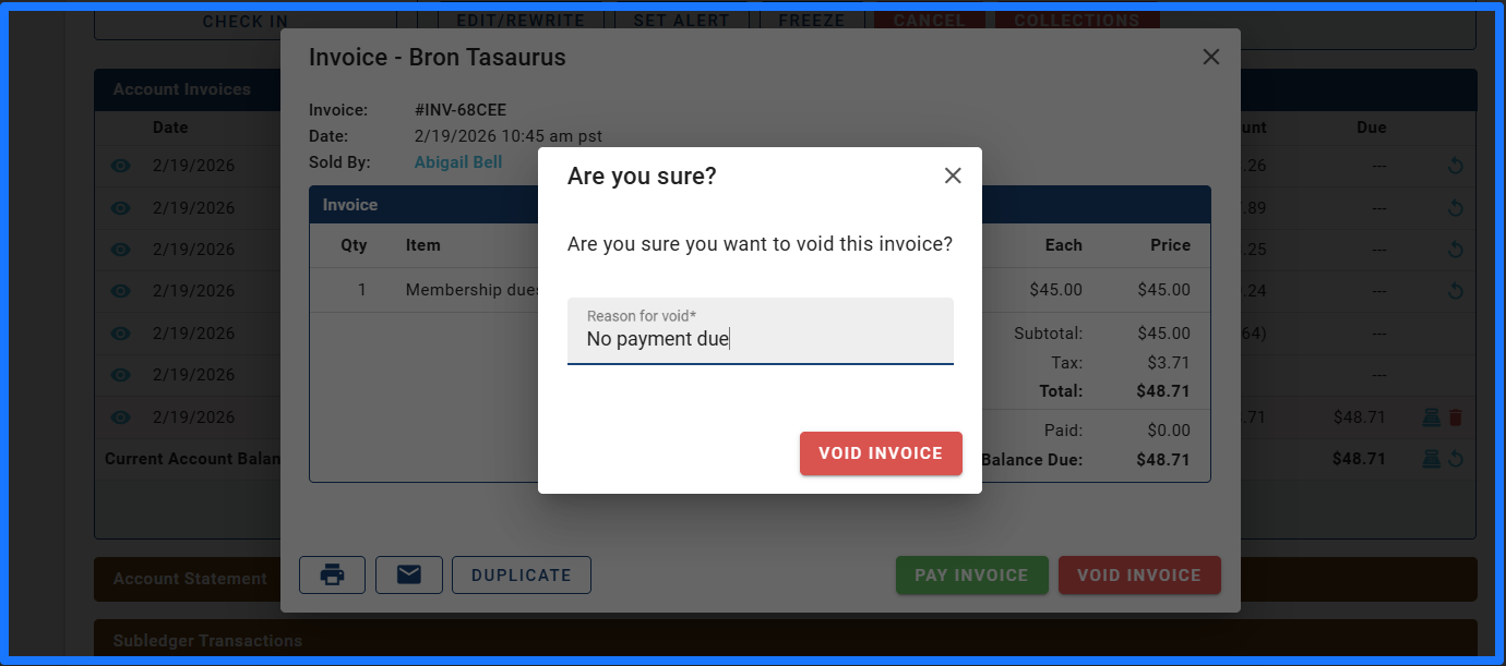 - The system will load a window asking Are you sure? And requiring a reason be inserted for the void.