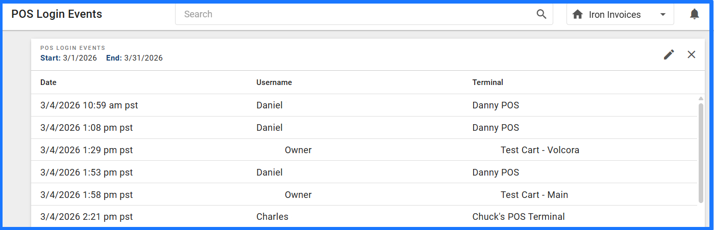 This report is a list of the given time period of Users and the POS Terminal they log into and when. This report helps in keeping track of who was logged in case there is a cash drawer count issue. Can have dates edited and specific users or terminals selected.