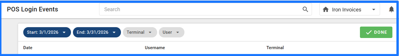Using the Edit pencil you can select the date range, the user, and terminal.