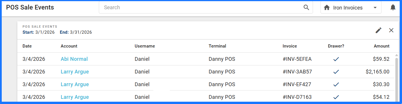 This report tracks and accounts for all transactions within the time period set for the report. It is listed out by the account that made the transaction, the User who sold the transaction, the Terminal in use, the assigned Invoice, if the cash drawer was used, and the total for the transaction.