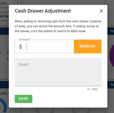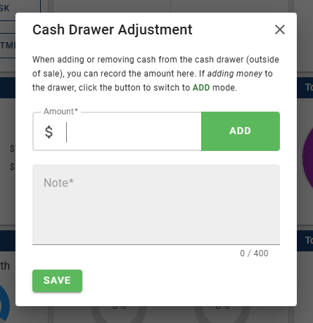 5. To add cash as an adjustment such as adding cash to the cash drawer for change to be made for transactions, click the Remove Button and it will toggle to the Add button. Add the amount of cash to be added, insert a Memo for explanation and click save.
