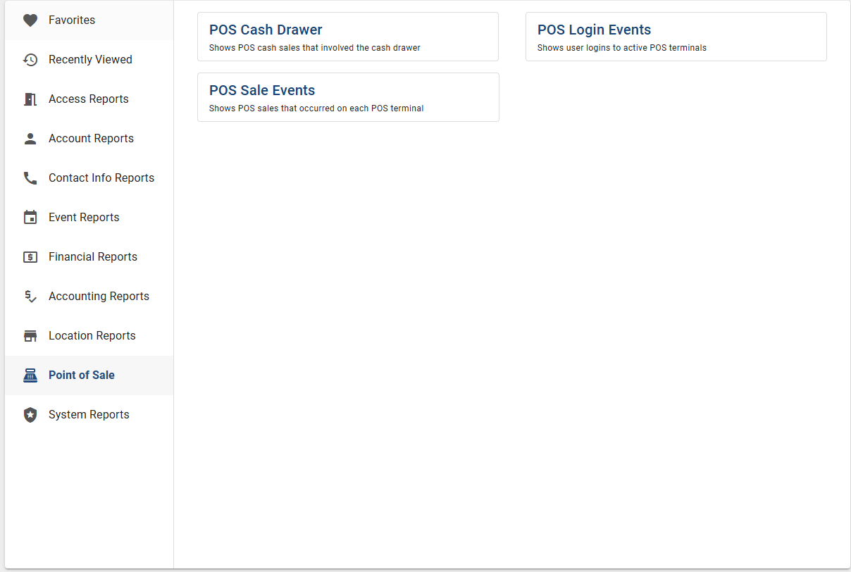 In the reports menu, the Point of Sale option is housed. The POS Login Events and the POS Sales Events report are located here.