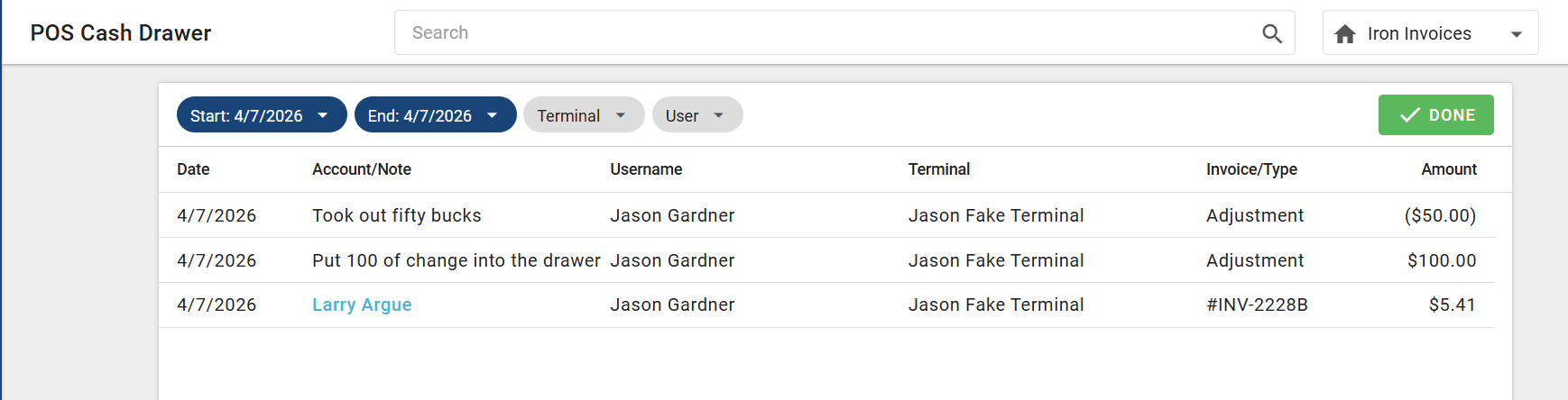 This report is used to to show when POS cash sales that involve the cash drawer are made. This includes all cash transactions made in the period but also adjustments to the drawer. The date of the transaction, the Account or note, the user who made the transaction, the terminal used, the Invoice or type (add or remove), as well as the amount of the transaction.